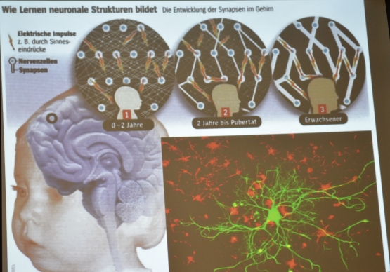 Dieser Unterschied kann enormen Einfluss auf den späteren Lebensweg haben. Was aber passiert beim Lernen? Das Gehirn besteht aus einer 100 Milliarden Nervenzellen, jede Nervenzelle kann mit bis zu 10000 anderen Nervenzellen über sogenannte Synapsen verbunden sein. Bereits bei der Geburt ist die Zahl der Nervenzellen festgelegt, allein die Verbindungen zwischen den Nervenzellen werden noch verändert. Lernen bedeutet dann auf neurobiologischer Sicht nichts anderes als Nervenzellverbindungen, die sich bewähren, neu zu bilden oder zu festigen. Beim Vergessen ist es dann eben ein Kappen von Verbindungen zwischen Nervenzellen.