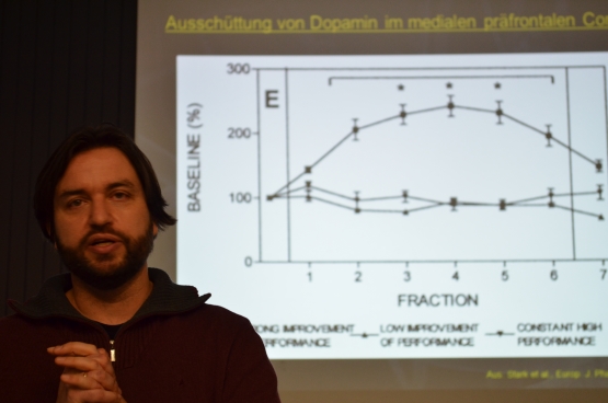 Etappen seien eine Methode zu lernen. Stück für Stück vorzugehen und mehrfaches Wiederholen seien prägend. Gerade ein "Aha-Effekt" nachdem man sich etwas selbst erklärt hat oder etwas einem schlüssig wird seien dazu wichtig. Dabei schütte der Mensch ein Hormon, Dopamin, welches einen motiviert und allgemein als Glückshormon gilt, aus. Mit diesem Hormon erklärte Herr Schulze auch gleich die Sucht des Computerspiels. Durch Erfolgserlebnisse, komme es zu diesem Aha-Effekt und somit zur Ausschüttung des Glückshormons, doch bleibe dabei ein Lerneffekt aus, wobei das Ganze mit Vorsicht zu genießen sei.