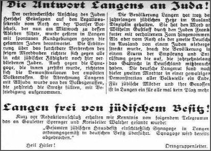 Das Judenpogrom der "Reichskristallnacht" wurde von der gestreuerten NS - Presse als "Demonstration der empörten Volksmassen" dargestellt. "Langener Wochenblatt vom 11. November 1938. (Quelle: A. Kurt, O. Schlader; Der Kreis Offenbach und das Dritte Reich.Leben und Politik.Verfolgung und Widerstand. Dreieich 1991)