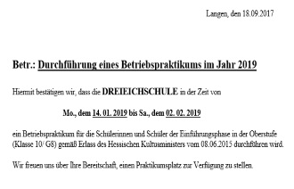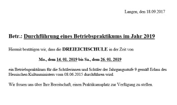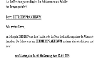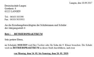 Anschreiben an die Eltern für das Betriebspraktikum 2019 Klasse 8