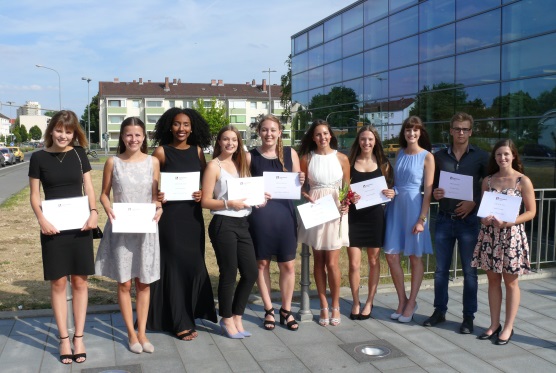 AbiturienINNen mit einem Notendurchschnitt von 1,2 und besser. Auf dem Bild zu sehen sind (von links nach rechts): Anna Yanushkevich. Lili Garreis, Mahlet Tadesse, Tess Maurus, Frieda Schlebusch, Sonja Arendt Nina Spagone, Denise Stegmayer, Michael Linke und Martina Boller.