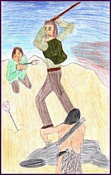Eines Tages erblickten die Dorfbewohner wieder ein Schiff am Horizont. Aber es waren keine Aleuter, sondern weiße Männer, die Kimki geschickt hatte, um die Dorfbewohner auf eine andere Insel zu bringen. Da die See ziemlich stürmisch war, konnte das Schiff nicht lange warten. Eilig packten Alle ihre Sachen zusammen und rannten zum Schiff. Am Strand fiel Karanas Bruder Ramo ein, dass er seinen Speer vergessen hatte. Deshalb lief er zum Dorf zurück. Als Karana in das Schiff einstieg, meinte sie, dass ihr Bruder Ramo schon auf dem Schiff wäre. Als das Schiff dann abgefahren war, sah sie ihren Bruder alleine und mit seinem Speer in der Hand am Strand stehen. Aus Angst ihren Bruder zu verlieren, sprang sie mit einem großen Korb, worin ihre ganzen Sachen waren, ins Wasser. Doch der Korb war sehr schwer und hinderte sie am Schwimmen. Deshalb musste sie sich von ihm trennen und sie ließ ihn auf den Meeresgrund fallen. Als sie bei ihrem Bruder am Strand war hoffte sie, das Schiff käme wieder zurück, aber es kam nicht.
