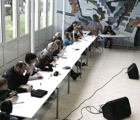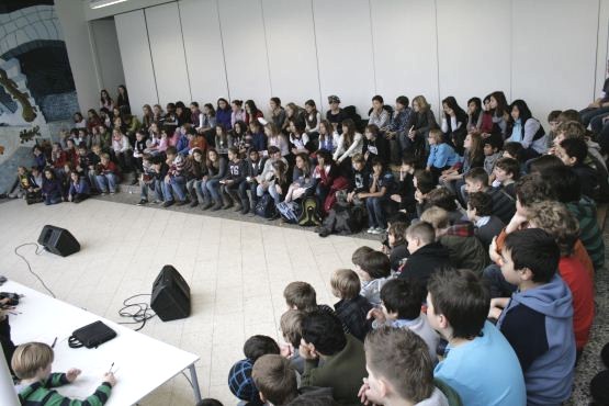 Die Klassen, die dem Wettbewerb in der Sitzmulde der Schule beiwohnten (Foto oben), entsandten jeweils ihre beiden besten Vorleser. Jeder hatte insgesamt ca. 5-7 Minuten, um sein Buch und seine Lesekünste vorzustellen.