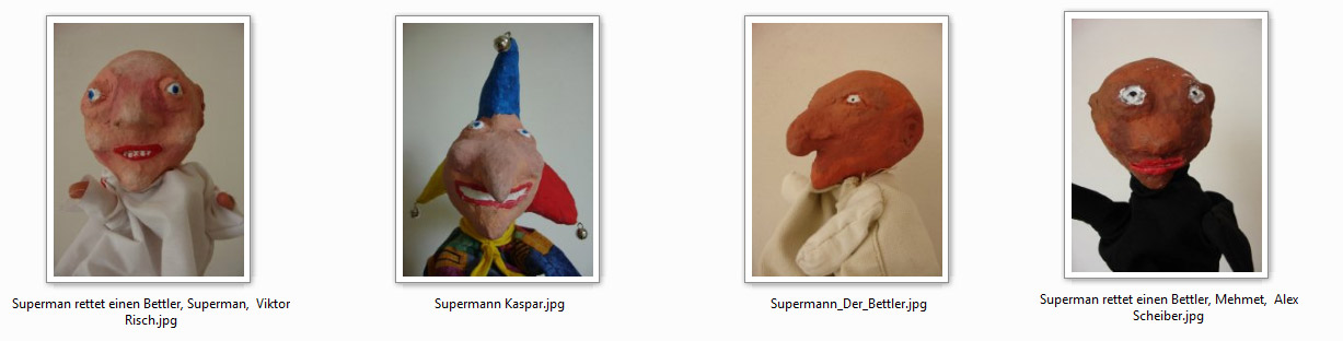 | von Sebastian M.-P., Viktor, Sebastian D., Alex | Der gemeine Bösewicht klaut dem armen Bettler die 20 Euro, die der nette Kaspar ihm gegeben hat. Aber Superman rettet ihn und das Geld.
