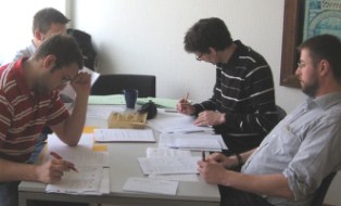 Aber nicht nur im großen Saal waren DSLer aktiv. Zu einem solchen Wettbewerb gehört auch ein Team von Korrektoren, die parallel zum Wettbewerb in kurzer Zeit die Siegerinnen und Sieger ermittelten sowie EDV und Urkundendruckerei. All dies war fest in der Hand der Dreieichschule, da Frau Horak und Herr Reimherr die EDV machten, Herr Semmler den Korrekturvorsitz führte und die Kollegen Finster und Dr. Leu mit korrigierten. Ebenso aktiv war Herr Hahn, ein ehemaliger Lehrer der Dreieichschule, an den sich viel noch sehr gerne erinnern und zu guter letzt auch noch Herr Pisch, der gerade sein Schulpraktikum bei uns absolvierte.
