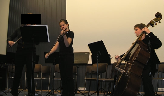 - N.N., Tabea Hofmann (8b, Violine) und Tobias Wolf (9a, Kontrabass) mit den Jiddischen Volksliedern Zemer Atik und Llamame