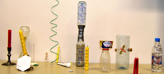 „Ich habe eine Kerzenuhr gemacht. Man muss die Kerze anzünden. Pro Stunde wird sie z. B. um 2 cm kleiner. Man kann das dann anhand der Markierung auf der Kerze ablesen.“