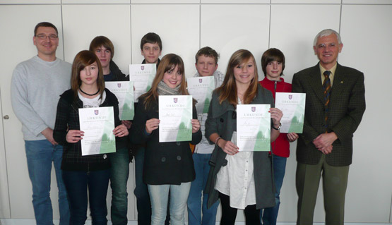 Eingerahmt sind die Sieger vom Koordinator, Herrn Semmler (links) und Schulleiter Berhard Zotz.