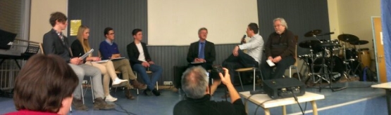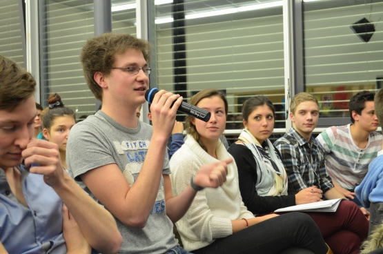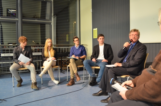 An der anschließenden Podiumsdiskussion – moderiert von Herrn Trier – nahmen außer Herrn Mann und Herrn Dr. Geiger noch vier PoWi-LK-Schüler teil.
