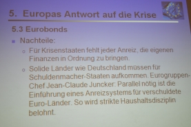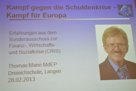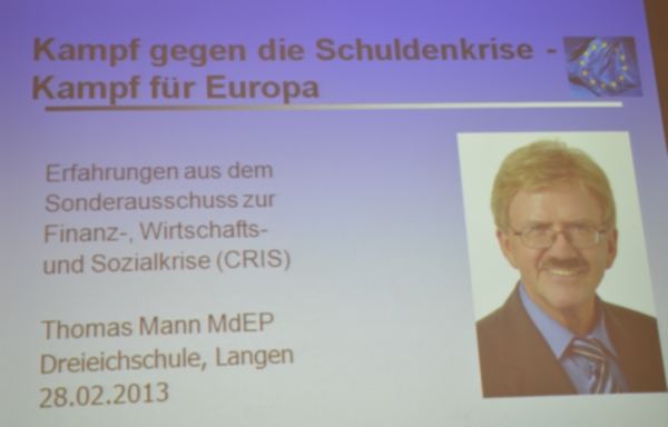 Im Rahmen der Themenwoche zu Europa und zur Schuldenkrise fand im Musiksaal eine weitere Veranstaltung mit dem Titel "Quo Vadis, Europa? Kampf gegen die Schuldenkrise - Kampf für Europa" statt. Eingeladen war der Abgeordnete des Europäischen Parlaments Thomas Mann (CDU).
