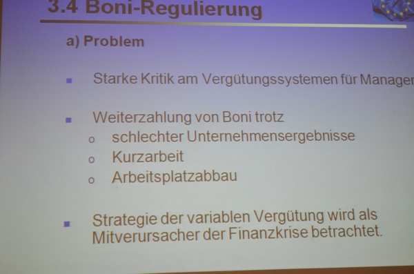 Herr Trier begrüßte Herrn Mann bei kräftigem Applaus und „outete sich als Europäer“.In seinem Vortrag ließ Thomas Mann ein wahres Rhetorik-Feuerwerk los und hielt dabei ein leidenschaftliches Plädoyer für Europa und das Europäische Parlament. Anspielungen auf die Frankfurter Eintracht und Äußerungen, die Peer Steinbrück ernsthafte Konkurrenz machten, sorgten im Publikum für einige Lacher.