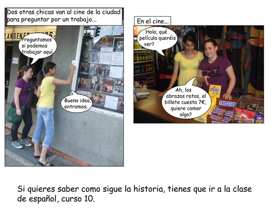 Wir nehmen zwar das Buch und die Vokabeln nach Plan durch, aber trotzdem bleibt genügend Zeit für anderes, z.B. Texte aus Zeitschriften lesen und bearbeiten, spanische Lieder anhören und ihre Songtexte vervollständigen, eigene Comics oder Fotostorys schreiben oder auch mal einen Film ansehen oder bzw. Spiele auf Spanisch spielen.