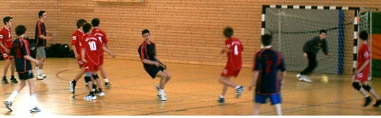 Dieser Landesentscheid begann nun ähnlich: Auch hier trafen wir im ersten Spiel des Turniers auf die stärkste Mannschaft, die Eichendorffschule aus Kelkheim (Kelkheim 1), die intensiv mit der Handballhochburg ihres Stadtteiles, der TSG Münster, zusammenarbeitet. Schließlich belegten deren ältere Jungens das letzte Jahr im Finale in Berlin den 10. Platz und deren Herren spielen 2. Bundesliga. Trotz der Niederlage mit 17:10 Toren (Halbzeit: 10:5) ließen wir uns nicht unterkriegen, sondern liefen – jetzt erst recht - zur Hochform auf.
